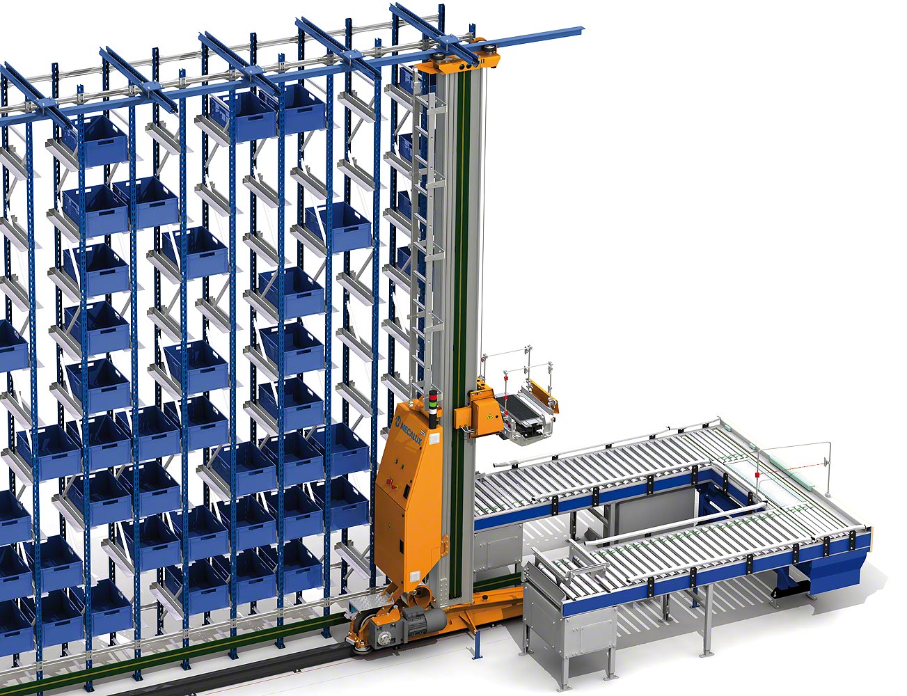 Система автоматизированного хранения и извлечения контейнеров и лотков, включающая стеллажные конструкции, кран-штабелёр и программное обеспечение - WMS управление складом, обеспечивающие её функциональность.