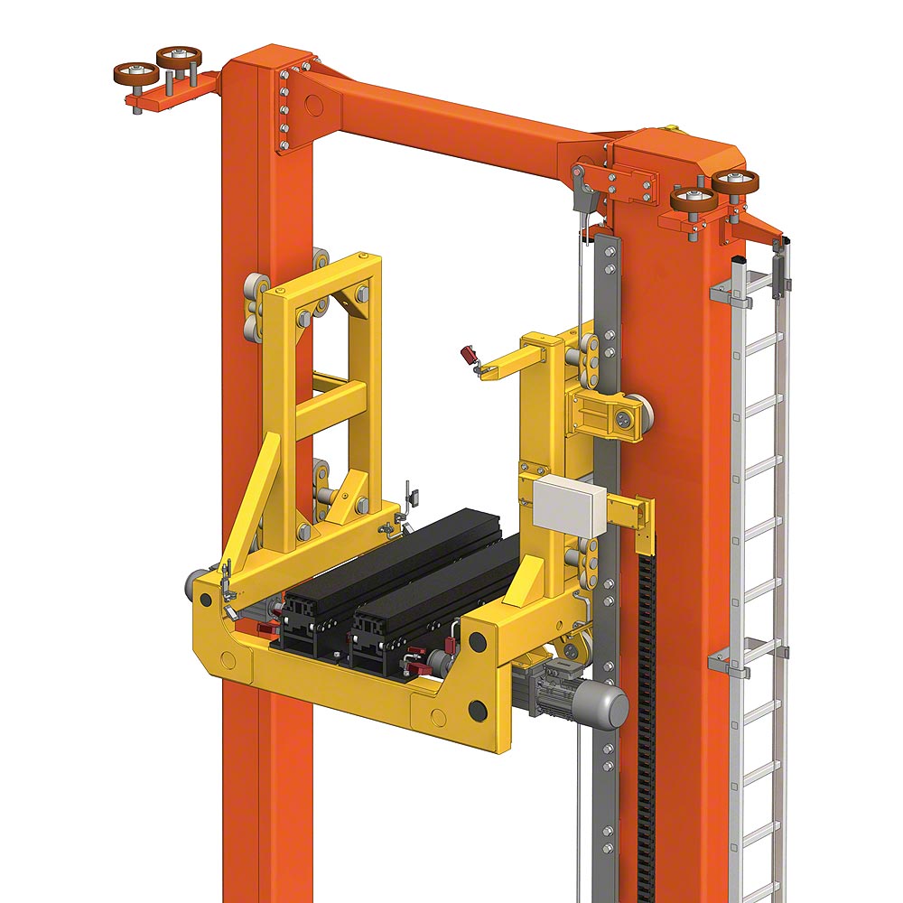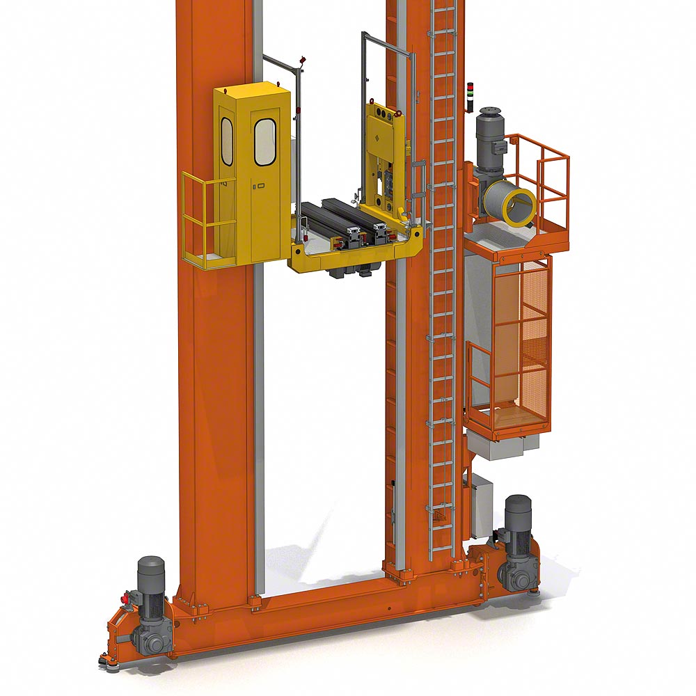 Данная разновидность крана оснащается опорной тележкой с одной или двумя вертикальными колоннами. Грузоподъемник с телескопическим захватом передвигается по колонне сверху вниз и может оперировать грузом по обе стороны от себя, за счет чего достигается экономия складского пространства. Ряд моделей кранов также оснащается кабиной оператора, установленной непосредственно на грузоподъемнике.