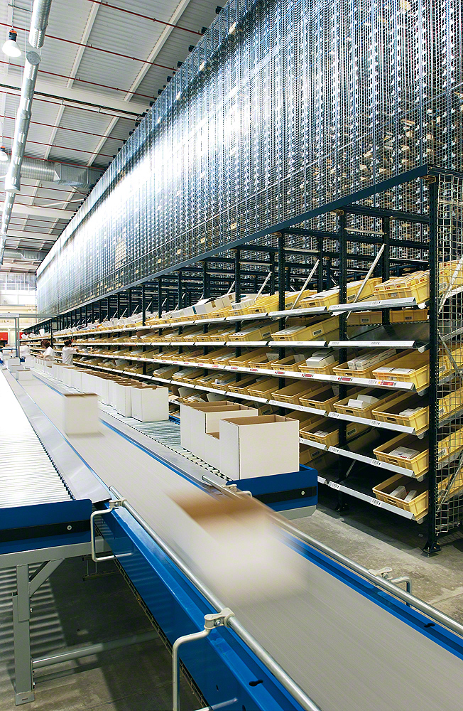 Система была создана для зон склада, где происходит большой объем работы по комплектации заказов. Она увеличивает число линий комплектации и позволяет избежать перемещений персонала, производящего эти операции.