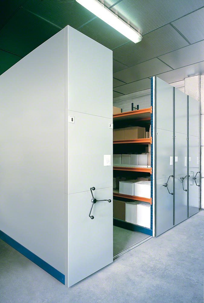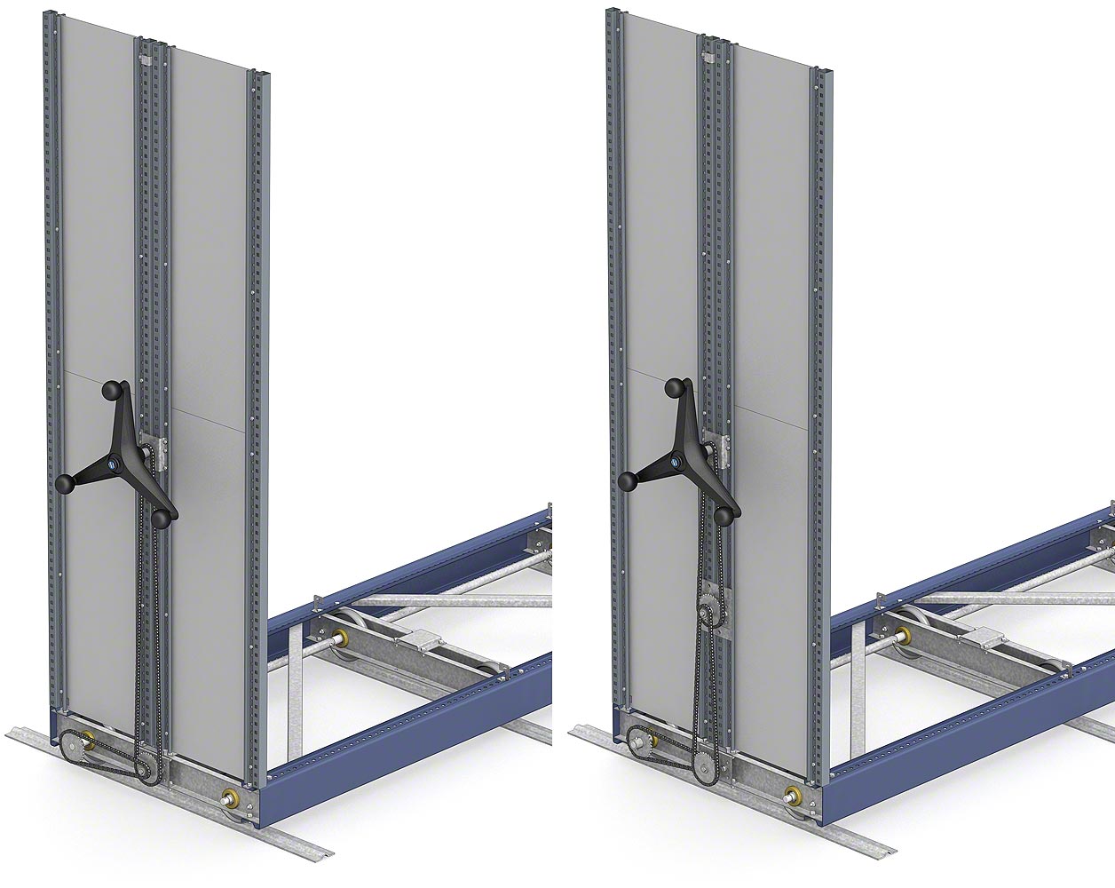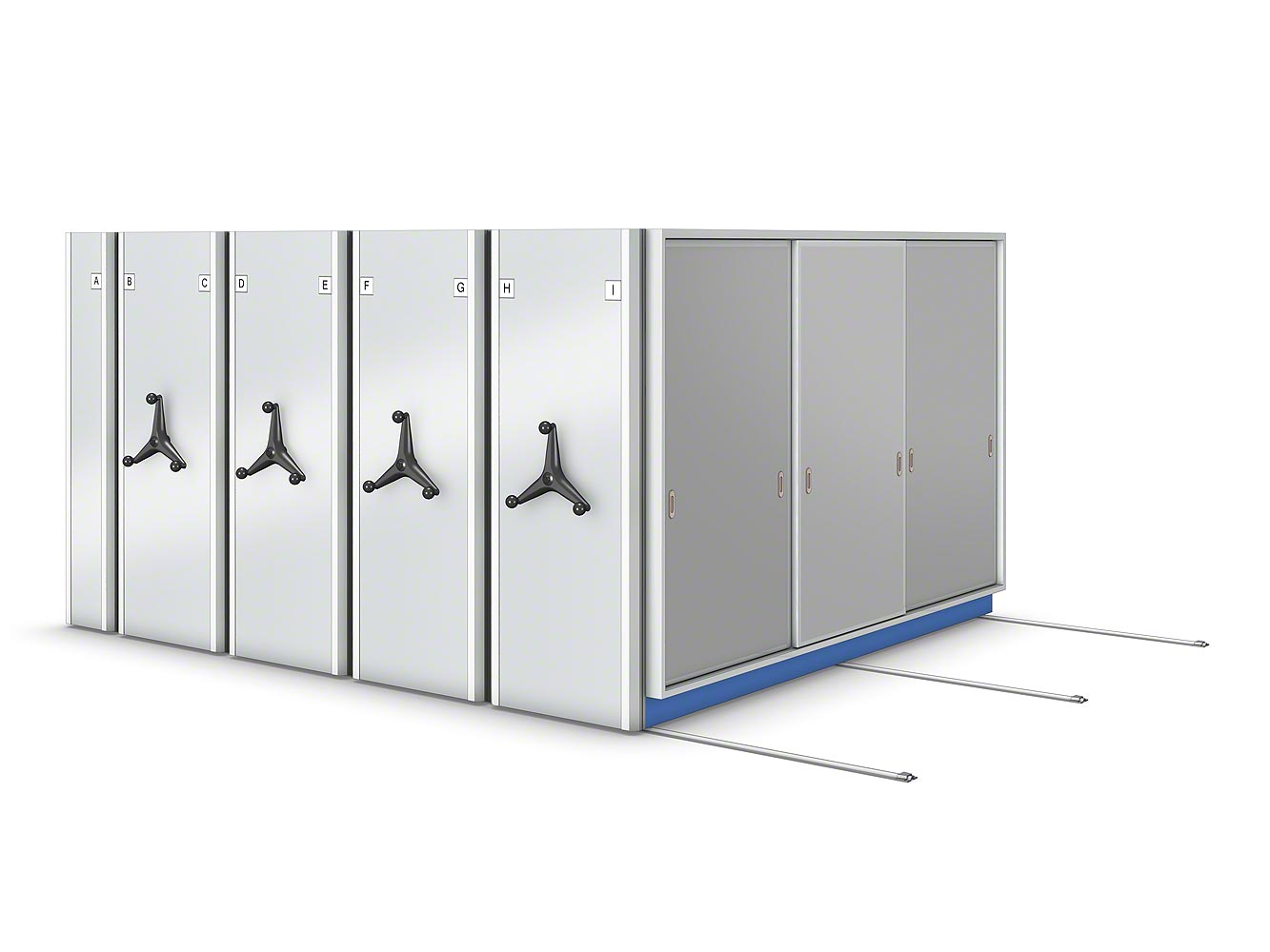 Перемещение вручную подходит для легких грузов, в частности для архивов, офисов. Передвижение осуществляется при помощи ручек, расположенных на внешней стороне каждого модуля.