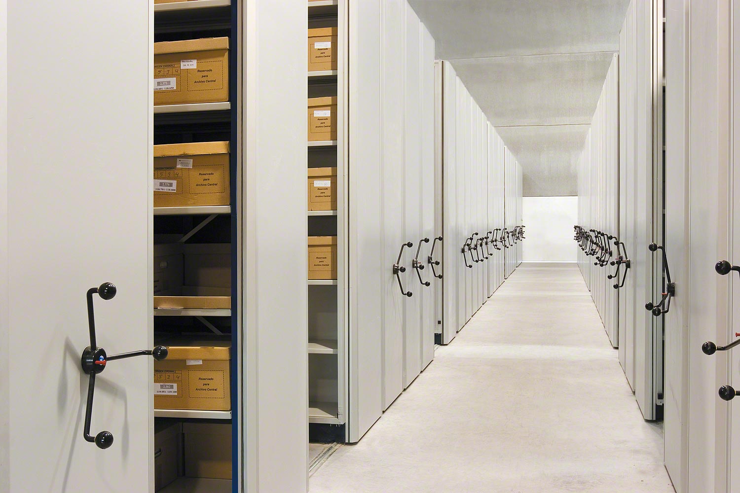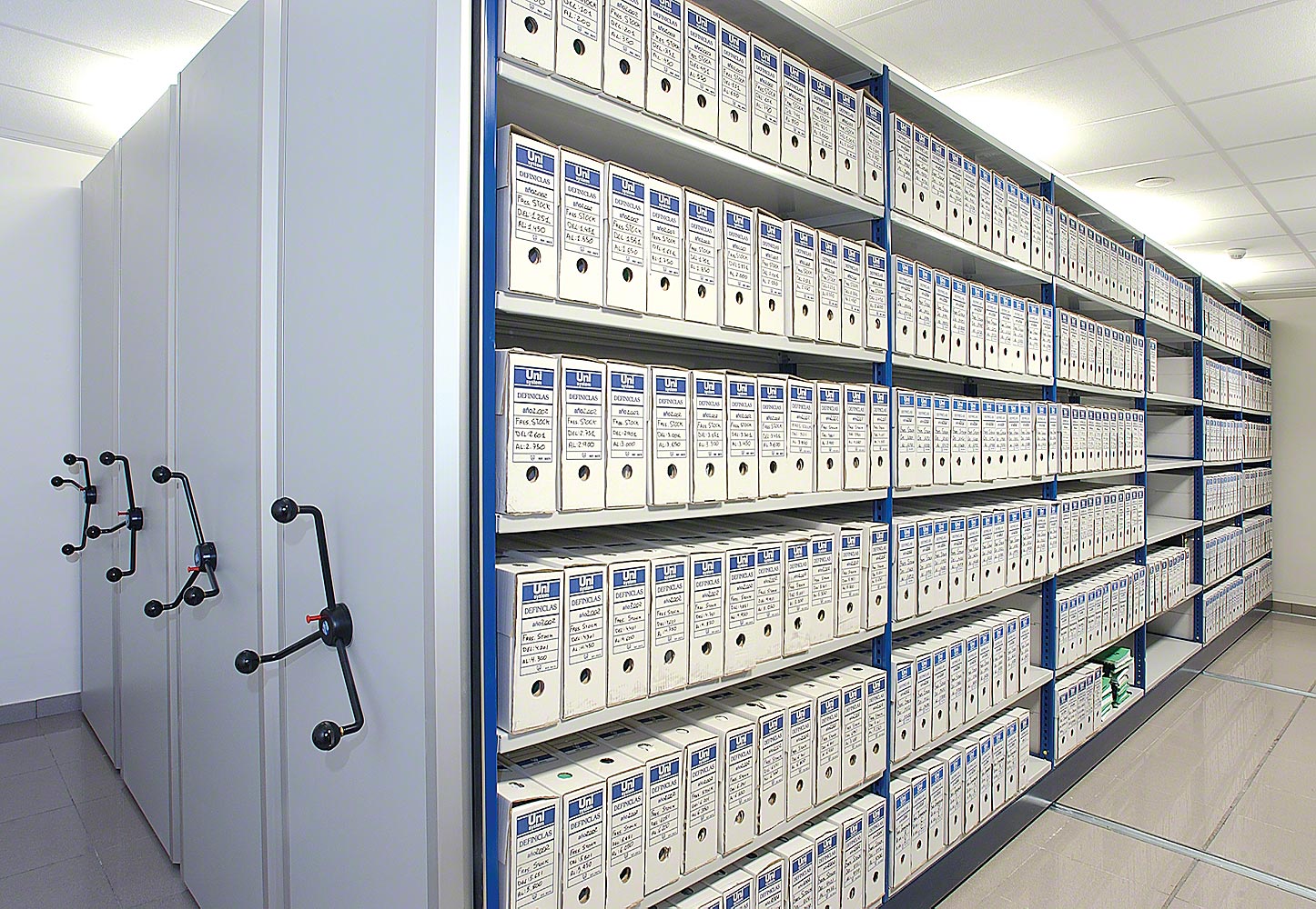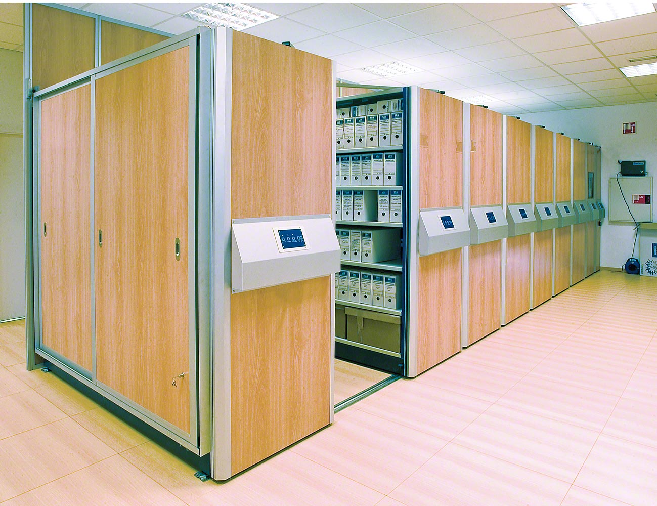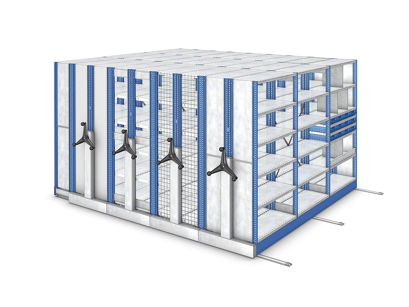 Стеллажная конструкция устанавливается на подвижную базу и перемещается по рельсам, что гарантирует порядок и оптимальное распределение складских или архивных модулей, а также значительную экономию места. Передвижные полочные стеллажи обеспечивают хорошую организацию архивных материалов и их защиту от несанкционированного доступа.