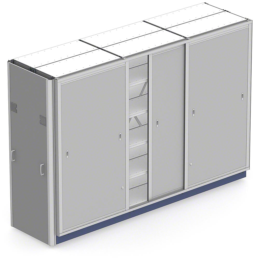 Автоматический механизм скольжения активируется нажатием выключателя, который автоматически меняет позицию стеллажа для обеспечения доступа к товару. Система перемещения состоит из редукторного электродвигателя, который не требует эксплуатационного ухода благодаря собственной системе непрерывного охлаждения масла. Данный модуль оснащен системой безопасности, предотвращающей самопроизвольное движение стеллажа при нахождении персонала в проходе.